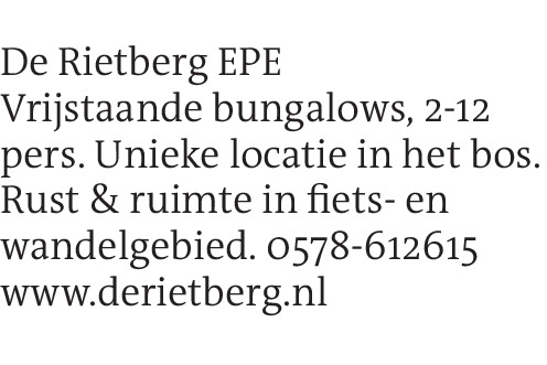 De Rietberg EPE Vrijstaande bungalows, 2-12 pers. Unieke locatie in het bos. Rust & ruimte in fiets- en wandelgebied. 0578-612615 www.derietberg.nl