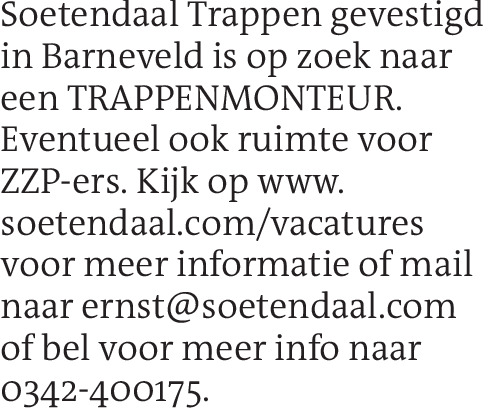 Soetendaal Trappen gevestigd in Barneveld is op zoek naar een TRAPPENMONTEUR. Eventueel ook ruimte voor ZZP-ers. Kijk op www. soetendaal.com/vacatures voor meer informatie of mail naar ernst@soetendaal.com of bel voor meer info naar 0342-400175.