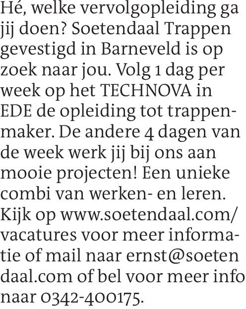 Hé, welke vervolgopleiding ga jij doen? Soetendaal Trappen gevestigd in Barneveld is op zoek naar jou. Volg 1 dag per week op het TECHNOVA in EDE de opleiding tot trappenmaker. De andere 4 dagen van de week werk jij bij ons aan mooie projecten! Een unieke combi van werken- en leren. Kijk op www.soetendaal.com/vacatures voor meer informatie of mail naar ernst@soeten daal.com of bel voor meer info naar 0342-400175.