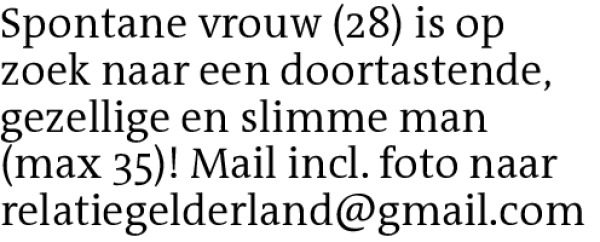 Spontane vrouw (28) is op zoek naar een doortastende, gezellige en slimme man (max 35)! Mail incl. foto naar relatiegelderland@gmail.comContact