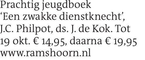 Prachtig jeugdboek ‘Een zwakke dienstknecht’, J.C. Philpot, ds. J. de Kok. Tot 19 okt. € 14,95, daarna € 19,95 www.ramshoorn.nl