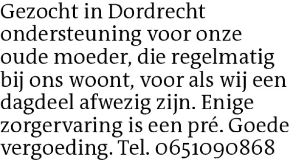 Gezocht in Dordrecht ondersteuning voor onze oude moeder, die regelmatig bij ons woont, voor als wij een dagdeel afwezig zijn. Enige zorgervaring is een pré. Goede vergoeding. Tel. 0651090868Contact