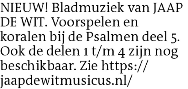 NIEUW! Bladmuziek van JAAP DE WIT. Voorspelen en koralen bij de Psalmen deel 5. Ook de delen 1 t/m 4 zijn nog beschikbaar. Zie https://jaapdewitmusicus.nl/Contact