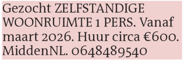 Publicatiedatum: Advertenties van 11.10.2025 in rubriek "Te huur gevraagd"