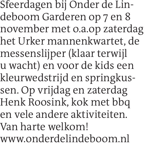 Sfeerdagen bij Onder de Lindeboom Garderen op 7 en 8 november met o.a.op zaterdag het Urker mannenkwartet, de messenslijper (klaar terwijl u wacht) en voor de kids een kleurwedstrijd en springkussen. Op vrijdag en zaterdag Henk Roosink, kok met bbq en vele andere aktiviteiten. Van harte welkom! www.onderdelindeboom.nlContact