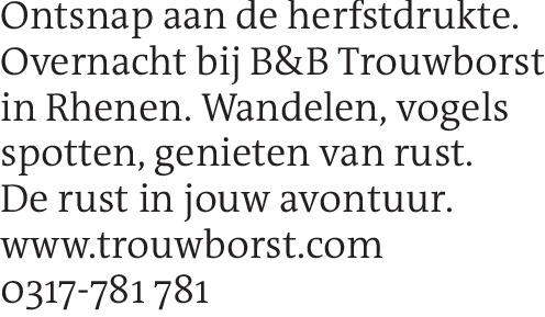 Ontsnap aan de herfstdrukte. Overnacht bij B&B Trouwborst in Rhenen. Wandelen, vogels spotten, genieten van rust. De rust in jouw avontuur. www.trouwborst.com 0317-781 781