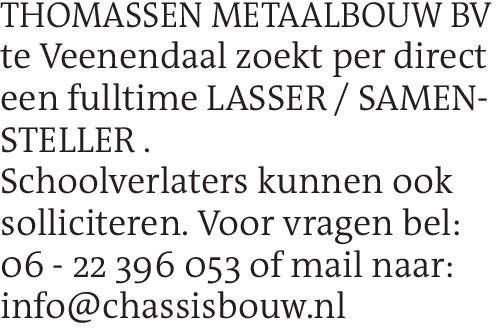 THOMASSEN METAALBOUW BV te Veenendaal zoekt per direct een fulltime LASSER / SAMENSTELLER . Schoolverlaters kunnen ook solliciteren. Voor vragen bel: 06 - 22 396 053 of mail naar: info@chassisbouw.nlContact