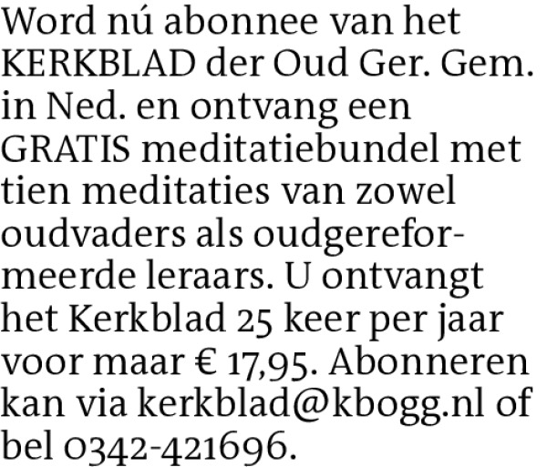 Word nú abonnee van het KERKBLAD der Oud Ger. Gem. in Ned. en ontvang een GRATIS meditatiebundel met tien meditaties van zowel oudvaders als oudgerefor-meerde leraars. U ontvangt het Kerkblad 25 keer per jaar voor maar € 17,95. Abonneren kan via kerkblad@kbogg.nl of bel 0342-421696.Contact