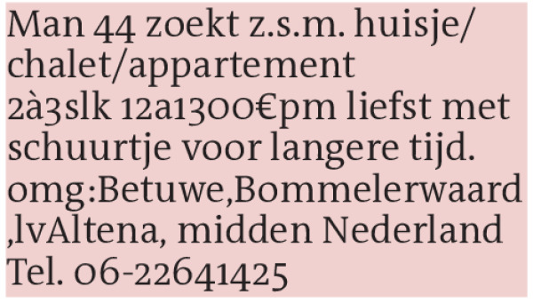 Man 44 zoekt z.s.m. huisje/chalet/appartement2à3slk 12a1300€pm liefst met schuurtje voor langere tijd. omg:Betuwe,Bommelerwaard,lvAltena, midden Nederland Tel. 06-22641425