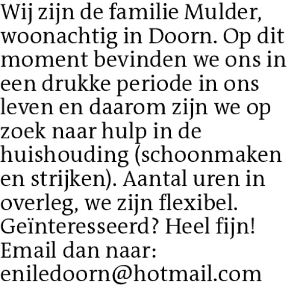 Wij zijn de familie Mulder, woonachtig in Doorn. Op dit moment bevinden we ons in een drukke periode in ons leven en daarom zijn we op zoek naar hulp in de huishouding (schoonmaken en strijken). Aantal uren in overleg, we zijn flexibel. Geïnteresseerd? Heel fijn! Email dan naar: eniledoorn@hotmail.comContact