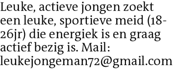Leuke, actieve jongen zoekt een leuke, sportieve meid (18-26jr) die energiek is en graag actief bezig is. Mail: leukejongeman72@gmail.comContact