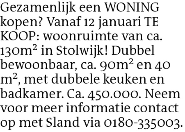 Gezamenlijk een WONING kopen? Vanaf 12 januari TE KOOP: woonruimte van ca. 130m² in Stolwijk! Dubbel bewoonbaar, ca. 90m² en 40 m², met dubbele keuken en badkamer. Ca. 450.000. Neem voor meer informatie contact op met Sland via 0180-335003.Meer advertenties van de provider