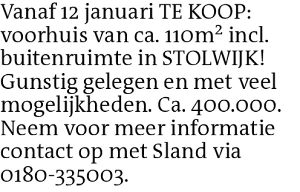 Vanaf 12 januari TE KOOP: voorhuis van ca. 110m² incl. buitenruimte in STOLWIJK! Gunstig gelegen en met veel mogelijkheden. Ca. 400.000. Neem voor meer informatie contact op met Sland via 0180-335003.Meer advertenties van de provider