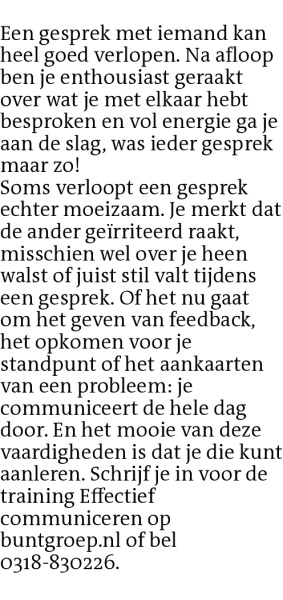 Een gesprek met iemand kan heel goed verlopen. Na afloop ben je enthousiast geraakt over wat je met elkaar hebt besproken en vol energie ga je aan de slag, was ieder gesprek maar zo!Soms verloopt een gesprek echter moeizaam. Je merkt dat de ander geïrriteerd raakt, misschien wel over je heen walst of juist stil valt tijdens een gesprek. Of het nu gaat om het geven van feedback, het opkomen voor je standpunt of het aankaarten van een probleem: je communiceert de hele dag door. En het mooie van deze vaardigheden is dat je die kunt aanleren. Schrijf je in voor de training Effectief communiceren op buntgroep.nl of bel