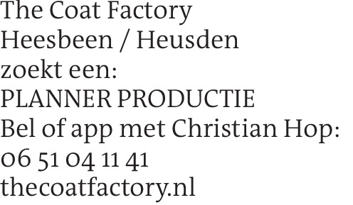 The Coat Factory Heesbeen / Heusden zoekt een: PLANNER PRODUCTIE Bel of app met Christian Hop: 06 51 04 11 41 thecoatfactory.nl