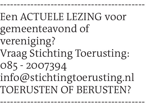 ------------------------------------------- Een ACTUELE LEZING voor gemeenteavond of vereniging? Vraag Stichting Toerusting: 085 - 2007394 info@stichtingtoerusting.nl TOERUSTEN OF BERUSTEN? -------------------------------------------