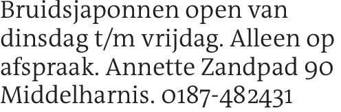 Bruidsjaponnen open van dinsdag t/m vrijdag. Alleen op afspraak. Annette Zandpad 90 Middelharnis. 0187-482431
