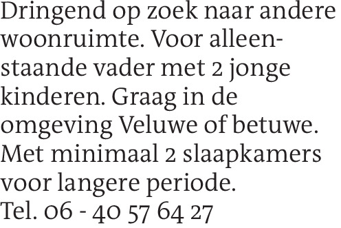 Dringend op zoek naar andere woonruimte. Voor alleenstaande vader met 2 jonge kinderen. Graag in de omgeving Veluwe of betuwe. Met minimaal 2 slaapkamers voor langere periode. Tel. 06 - 40 57 64 27