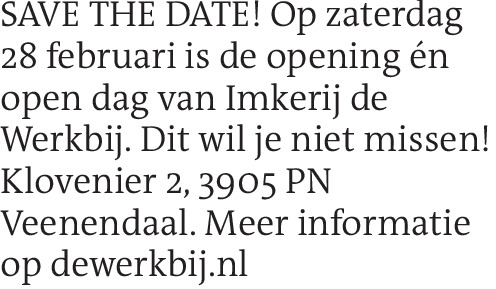 SAVE THE DATE! Op zaterdag 28 februari is de opening én open dag van Imkerij de Werkbij. Dit wil je niet missen! Klovenier 2, 3905 PN Veenendaal. Meer informatie op dewerkbij.nlContact
