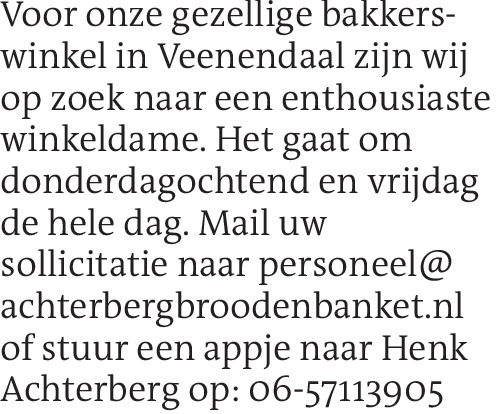 Voor onze gezellige bakkerswinkel in Veenendaal zijn wij op zoek naar een enthousiaste winkeldame. Het gaat om donderdagochtend en vrijdag de hele dag. Mail uw sollicitatie naar personeel@achterbergbroodenbanket.nl of stuur een appje naar Henk Achterberg op: 06-57113905