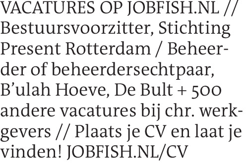 VACATURES OP JOBFISH.NL // Bestuursvoorzitter, Stichting Present Rotterdam / Beheerder of beheerdersechtpaar, B’ulah Hoeve, De Bult + 500 andere vacatures bij chr. werkgevers // Plaats je CV en laat je vinden! JOBFISH.NL/CV