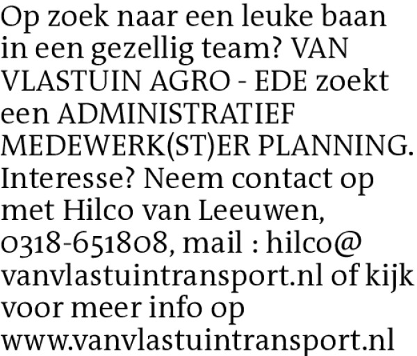 Op zoek naar een leuke baan in een gezellig team? VAN VLASTUIN AGRO - EDE zoekt een ADMINISTRATIEF MEDEWERK(ST)ER PLANNING. Interesse? Neem contact op met Hilco van Leeuwen,0318-651808, mail : hilco@