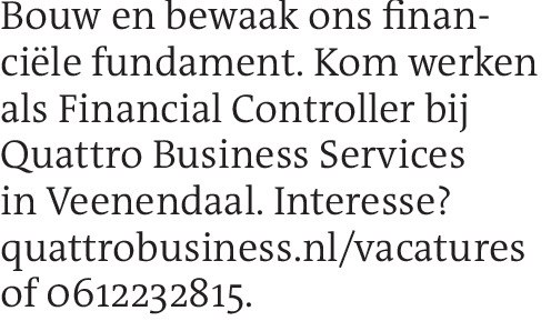 Bouw en bewaak ons finan- ciële fundament. Kom werken als Financial Controller bij Quattro Business Services in Veenendaal. Interesse? quattrobusiness.nl/vacatures of 0612232815.