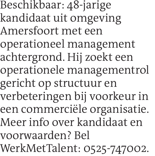 Beschikbaar: 48-jarige kandidaat uit omgeving Amersfoort met een operationeel management achtergrond. Hij zoekt een operationele managementrol gericht op structuur en verbeteringen bij voorkeur in een commerciële organisatie. Meer info over kandidaat en voorwaarden? Bel WerkMetTalent: 0525-747002.