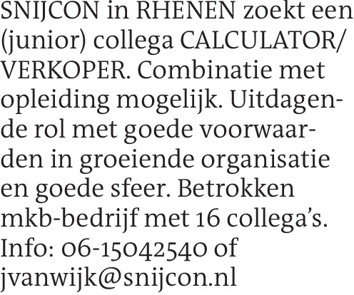 SNIJCON in RHENEN zoekt een (junior) collega CALCULATOR/VERKOPER. Combinatie met opleiding mogelijk. Uitdagende rol met goede voorwaarden in groeiende organisatie en goede sfeer. Betrokken mkb-bedrijf met 16 collega’s.Info: 06-15042540 of jvanwijk@snijcon.nl