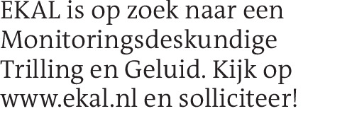 EKAL is op zoek naar een Monitoringsdeskundige Trilling en Geluid. Kijk op www.ekal.nl en solliciteer!