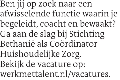 Ben jij op zoek naar een afwisselende functie waarin je begeleidt, coacht en bewaakt? Ga aan de slag bij Stichting Bethani als Cordinator Huishoudelijke Zorg. Bekijk de vacature op: werkmettalent.nl/vacatures.