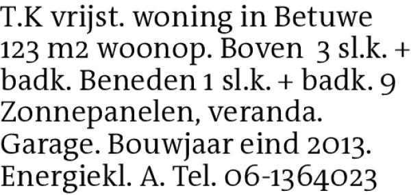 T.K vrijst. woning in Betuwe 123 m2 woonop. Boven 3 sl.k. + badk. Beneden 1 sl.k. + badk. 9 Zonnepanelen, veranda. Garage. Bouwjaar eind 2013. Energiekl. A. Tel. 06-1364023Contact