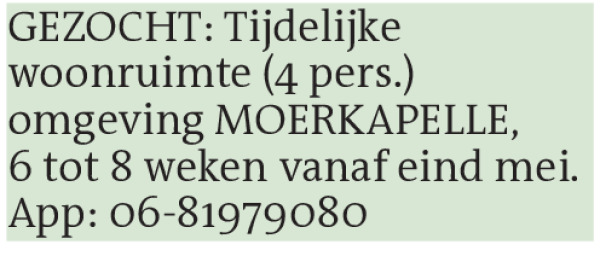 GEZOCHT: Tijdelijke woonruimte (4 pers.) omgeving MOERKAPELLE,6 tot 8 weken vanaf eind mei. App: 06-81979080