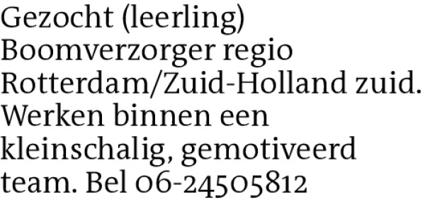 Gezocht (leerling) Boomverzorger regio Rotterdam/Zuid-Holland zuid. Werken binnen een kleinschalig, gemotiveerd team. Bel 06-24505812Contact