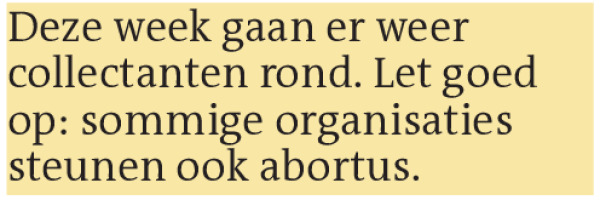 Deze week gaan er weer collectanten rond. Let goed op: sommige organisaties steunen ook abortus.