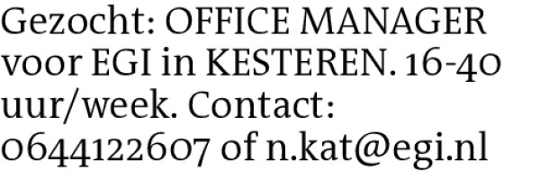 Gezocht: OFFICE MANAGER voor EGI in KESTEREN. 16-40 uur/week. Contact: 0644122607 of n.kat@egi.nlContact