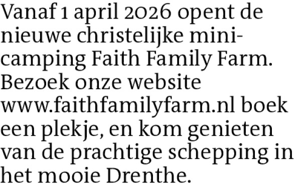Vanaf 1 april 2026 opent de nieuwe christelijke mini-camping Faith Family Farm. Bezoek onze website www.faithfamilyfarm.nl boek een plekje, en kom genieten van de prachtige schepping in het mooie Drenthe.Contact