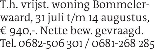 T.h. vrijst. woning Bommelerwaard, 31 juli t/m 14 augustus, € 940,-. Nette bew. gevraagd. Tel. 0682-506 301 / 0681-268 285Contact