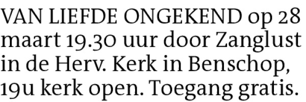 VAN LIEFDE ONGEKEND op 28 maart 19.30 uur door Zanglust in de Herv. Kerk in Benschop,