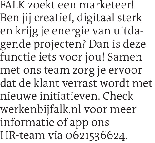 FALK zoekt een marketeer! Ben jij creatief, digitaal sterk en krijg je energie van uitdagende projecten? Dan is deze functie iets voor jou! Samen met ons team zorg je ervoor dat de klant verrast wordt met nieuwe initiatieven. Check werkenbijfalk.nl voor meer informatie of app ons HR-team via 0621536624.Contact