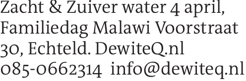 Zacht & Zuiver water 4 april, Familiedag Malawi Voorstraat 30, Echteld. DewiteQ.nl 085-0662314 info@dewiteq.nl