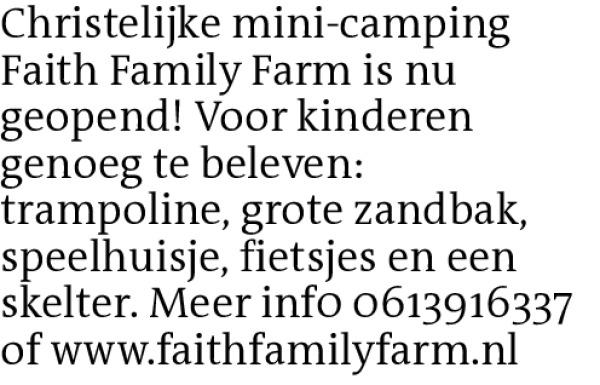 Christelijke mini-camping Faith Family Farm is nu geopend! Voor kinderen genoeg te beleven: trampoline, grote zandbak, speelhuisje, fietsjes en een skelter. Meer inf0 0613916337 of www.faithfamilyfarm.nlContact