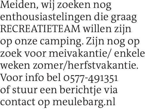 Meiden, wij zoeken nog enthousiastelingen die graag RECREATIETEAM willen zijn op onze camping. Zijn nog op zoek voor meivakantie/ enkele weken zomer/herfstvakantie. Voor info bel 0577-491351 of stuur een berichtje via contact op meulebarg.nlContact
