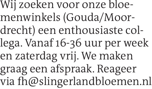 Wij zoeken voor onze bloemenwinkels (Gouda/Moordrecht) een enthousiaste col- lega. Vanaf 16-36 uur per week en zaterdag vrij. We maken graag een afspraak. Reageer via fh@slingerlandbloemen.nl