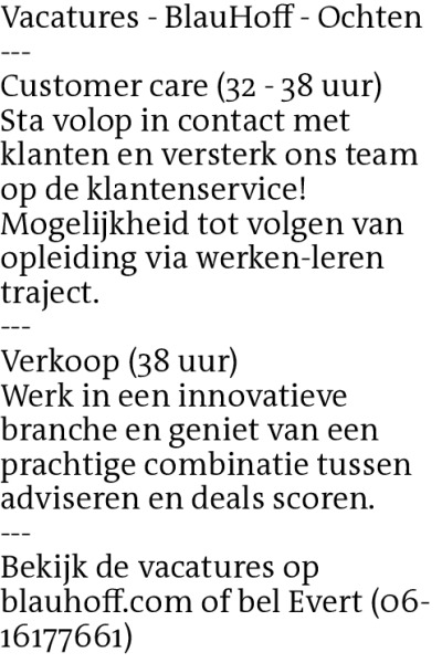 Bekijk de vacatures op blauhoff.com of bel Evert (06-16177661)