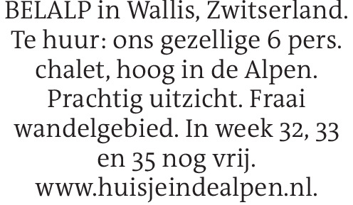 BELALP in Wallis, Zwitserland. Te huur: ons gezellige 6 pers. chalet, hoog in de Alpen. Prachtig uitzicht. Fraai wandelgebied. In week 32, 33 en 35 nog vrij. www.huisjeindealpen.nl.