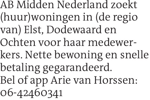 AB Midden Nederland zoekt (huur)woningen in (de regio van) Elst, Dodewaard en Ochten voor haar medewerkers. Nette bewoning en snelle betaling gegarandeerd. Bel of app Arie van Horssen: 06-42460341