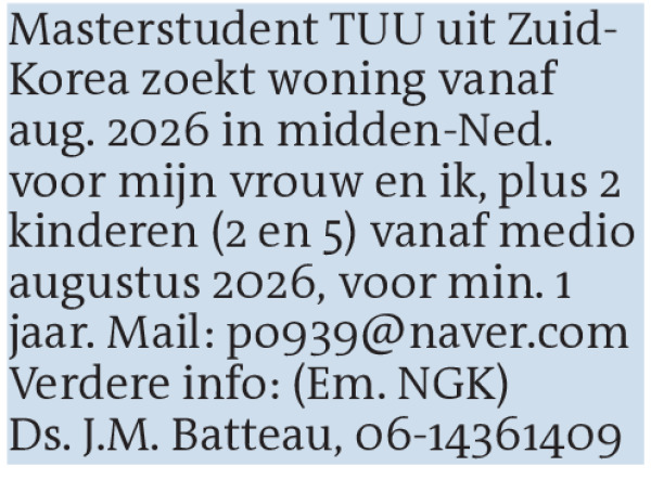 Masterstudent TUU uit Zuid-Korea zoekt woning vanaf aug. 2026 in midden-Ned. voor mijn vrouw en ik, plus 2 kinderen (2 en 5) vanaf medio augustus 2026, voor min. 1 jaar. Mail: po939@naver.com Verdere info: (Em. NGK)Ds. J.M. Batteau, 06-14361409