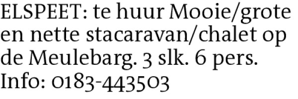 ELSPEET: te huur Mooie/grote en nette stacaravan/chalet op de Meulebarg. 3 slk. 6 pers. Info: 0183-443503Contact