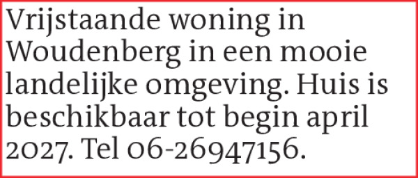 Vrijstaande woning in Woudenberg in een mooie landelijke omgeving. Huis is beschikbaar tot begin april 2027. Tel 06-26947156.Contact